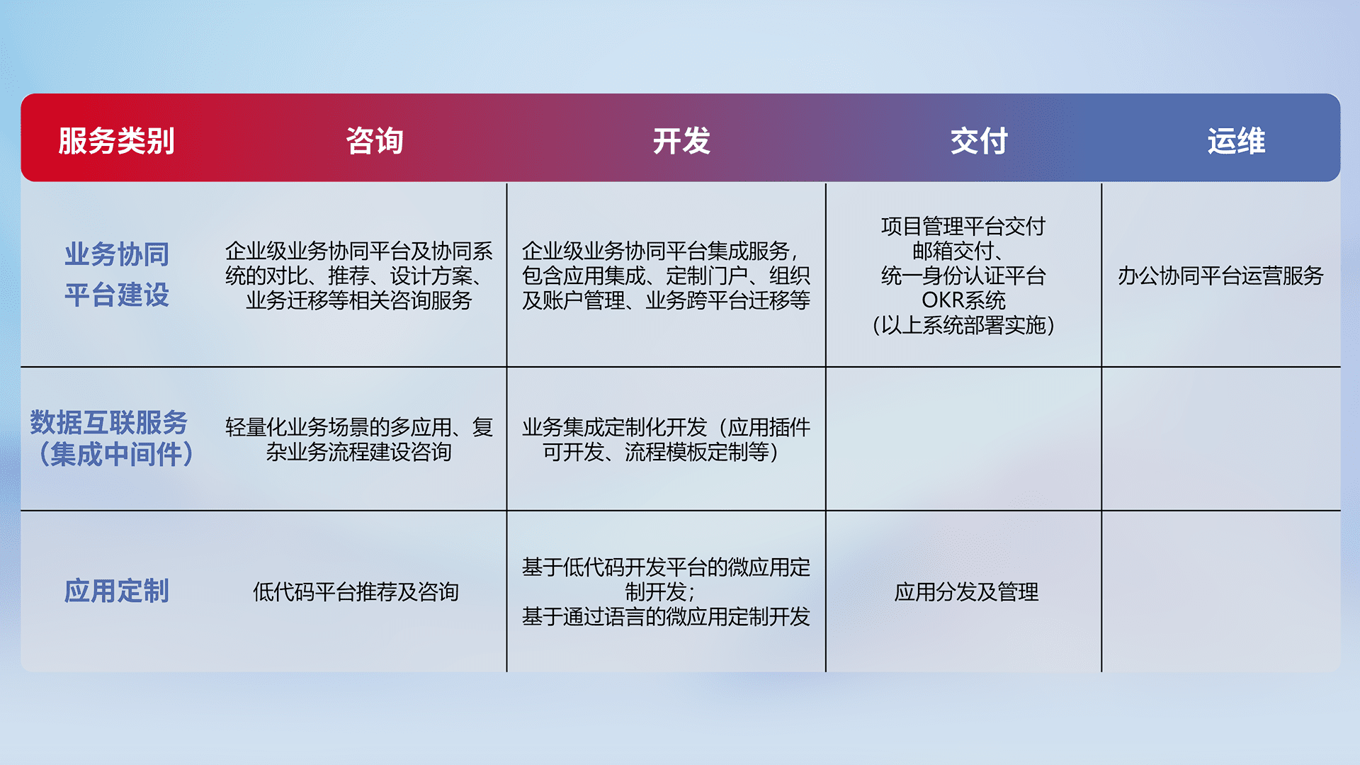 针对钉钉、、、企微、、、、IDaas等平台级产品提供产品的规划、、、方案、、交付、、、定制化开发等服务,,实现如统一协同办公、、智能客户服务、、混合会议管理、、、、智能数据查询、、等业务场景,,,实现数字化转型。。。